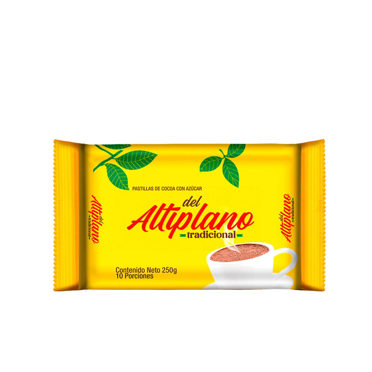 Pastillas de cocoa con azúcar Del Altiplano en presentación de 250 g. Un producto conveniente y económico para elaborar la tradicional bebida sabor a chocolate.