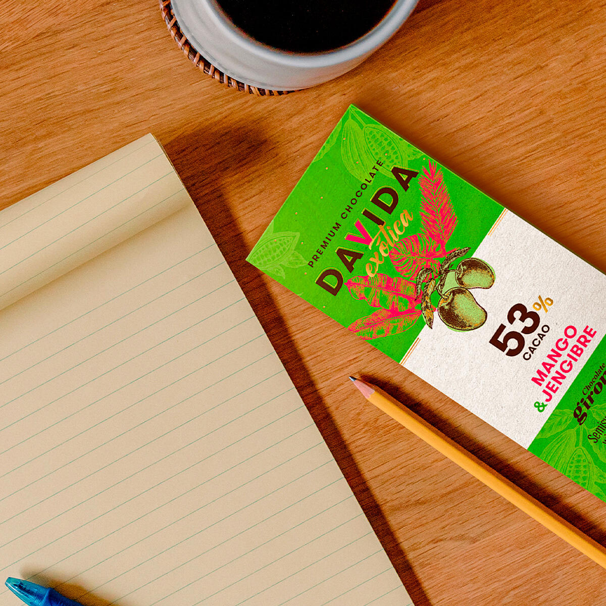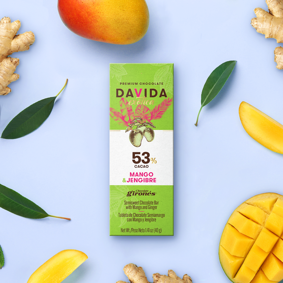 ¡Una combinación fascinante! La barra DAVIDA de Mango y Jengibre combina magistralmente estos alimentos con el delicioso chocolate en 53% cacao. Es definitivamente una experiencia exótica de sabores dulces y un toque picante. ¡Tienes que probarla!