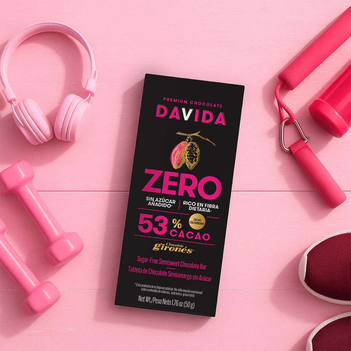 ¡Tu barra de chocolate favorita ahora sin azúcar! La barra DAVIDA Zero está hecha con granos de cacao de la más alta calidad para crear una sensación balanceada y agradable. Contiene 53% cacao sin azúcar, una combinación exquisita para los amantes del chocolate semiamargo. Sin azúcar añadido. Rico en fibra dietaria.